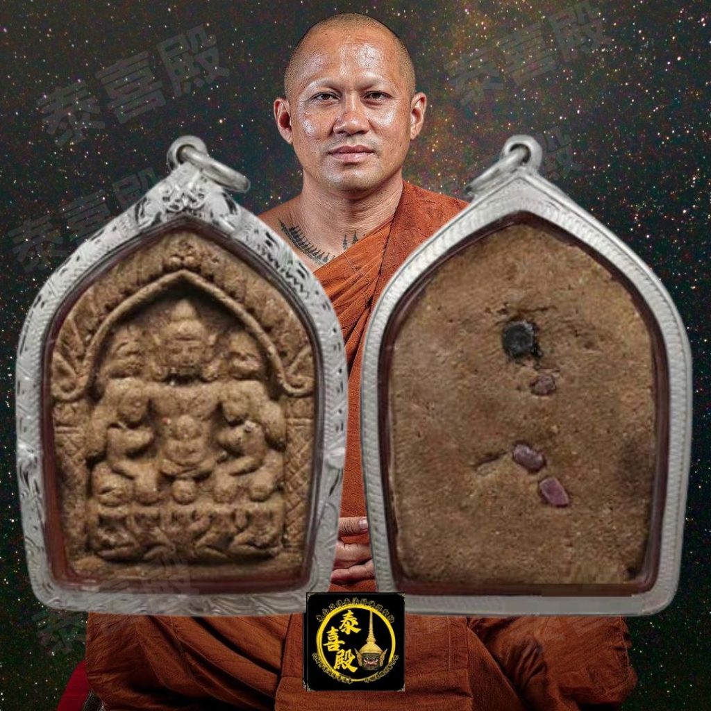 此法物乃師傅極早期作品,主材料以上一期咩霸同料的女鬼碰派、骨粒、屍肉、七墓土、人緣灣藥及尊師聖血等製煉而成,後方入藏一根純銀符管、力泥及能量礦石。法物全部均為早期手模,難得此枚壓模狀態十分良好,清晰可見九女共侍坤平及部分神情,完成後於法壇加持三個月,再由阿贊坤皮親自加持。整批主材料由龍婆通及阿贊坤皮聯手製煉及開光加持,尊師指剩是擁有這批碰派泥粉已經有很強的力量,及後大多靈驗的法物都有加入少量此批碰派。